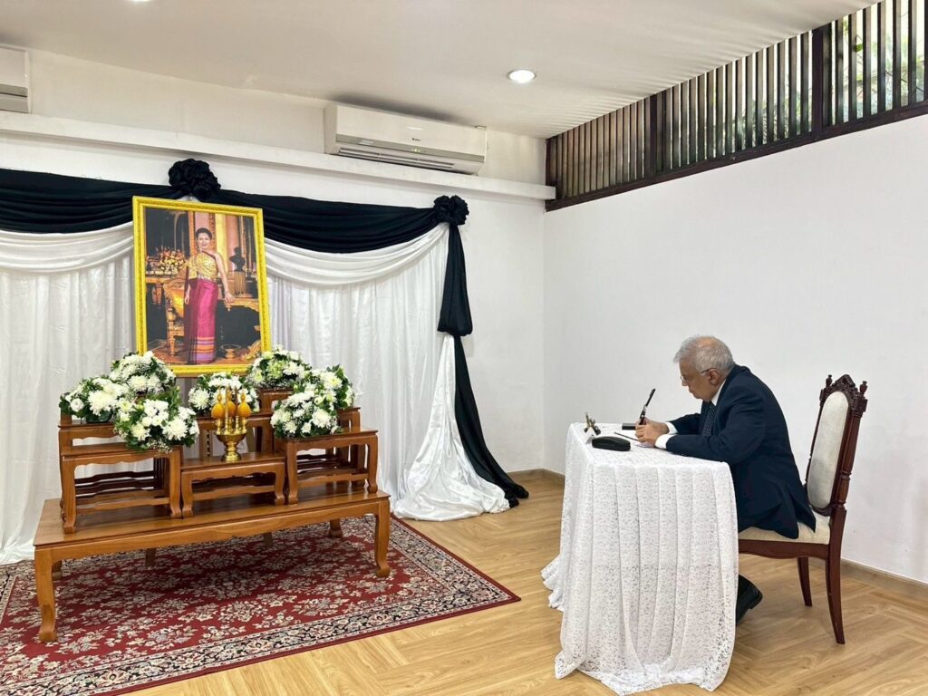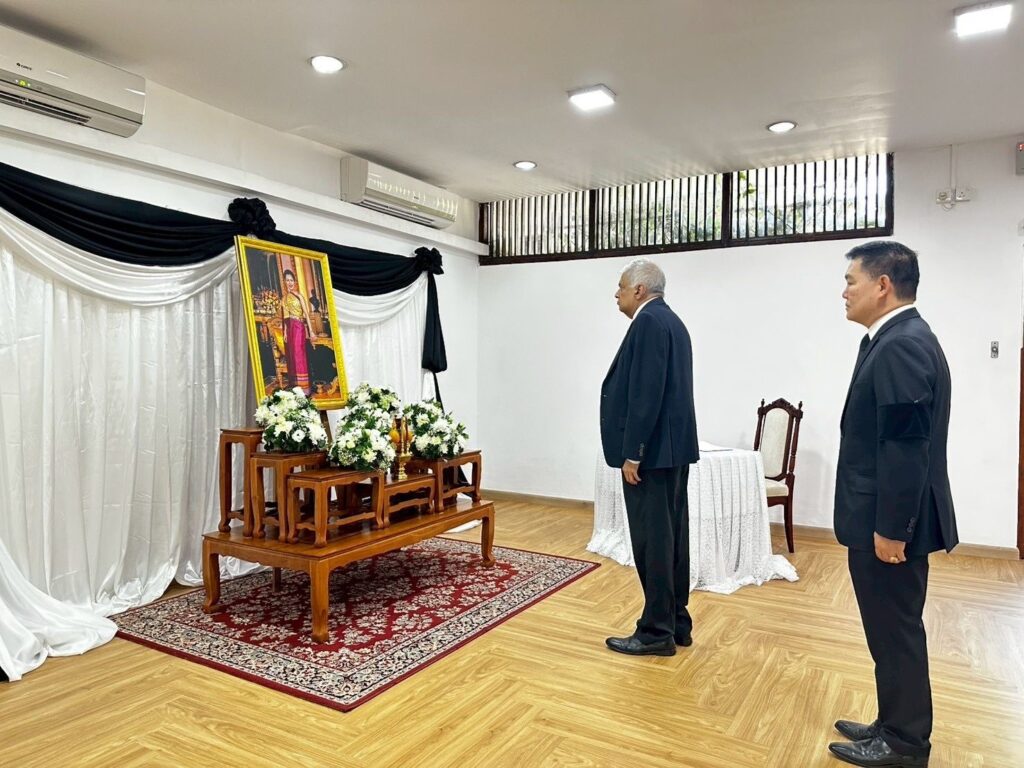 Political තායිලන්තයේ රැජිනට අවසන් ගෞරව දැක්වීමට ගිය රනිල් සහා වජිර ByBlog October 31, 2025 අභාවප්රාප්ත තායිලන්තයේ රැජිනිය වූ Sirikit රැජිනිය වෙත අවසන් ගෞරවය දැක්වීමට හිටපු ජනාධිපති රනිල් වික්රමසිංහ සහා වජිර අබේවර්ධන අද (31) කටයුතු කර තිබෙනවා. ඒ කොළඹ පිහිටි තායිලන්ත තානාපති කාර්යාලයේදී. එහි තිබූ ඇයගේ ඡායාරූපයට පුෂ්පෝපහාර දැක්වීමට ද හිටපු ජනාධිපතිවරයා කටයුතුකර තිබෙනවා.